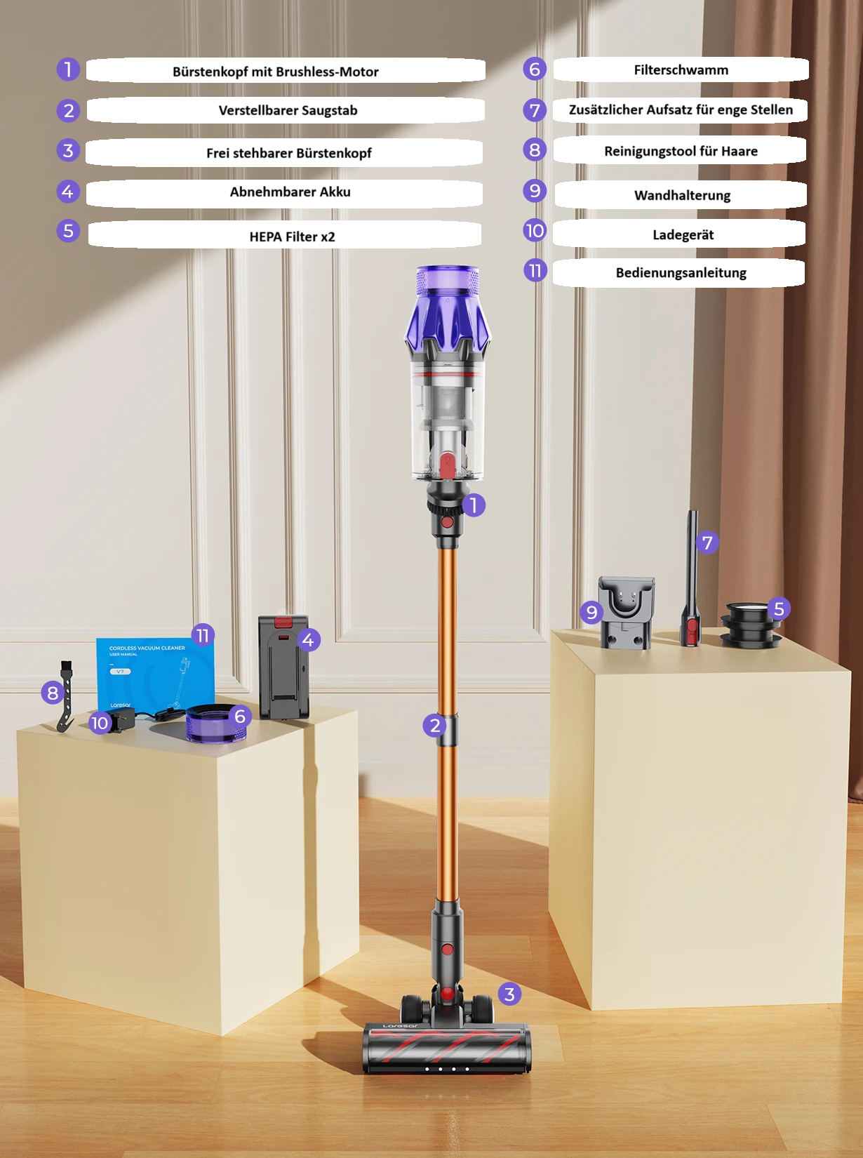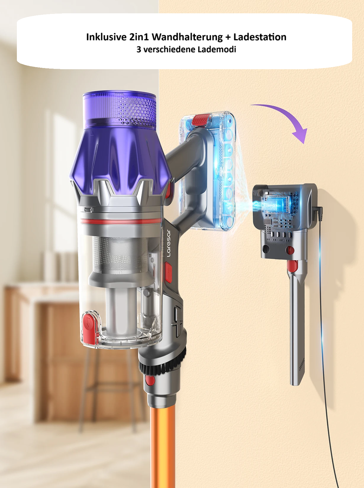 Kabelloser+Beutelloser Akkustaubsauger Laresar V7 500W 50KPA mit Wandhalterung