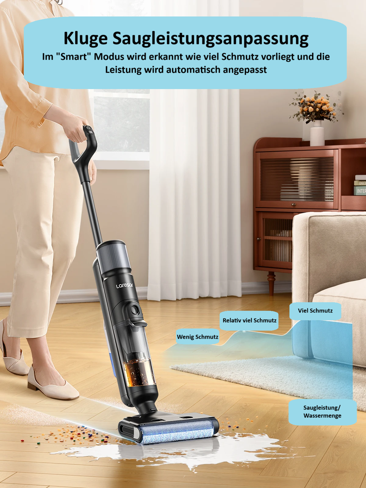 Mit einer beeindruckenden Saugleistung von 13.000 Pa und einer Motorleistung von 230 Watt entfernt der Laresar M3 zuverlässig Staub, Krümel, Tierhaare und sogar hartnäckigen Schmutz.