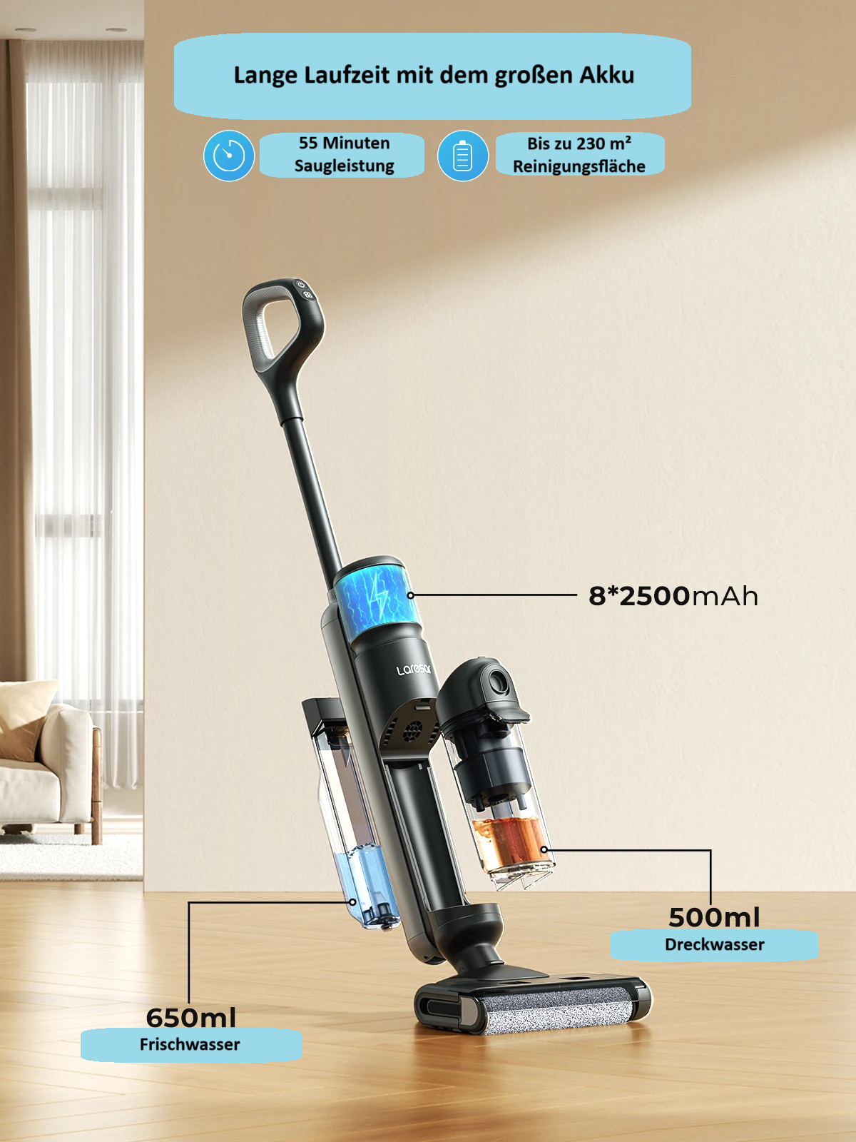 Der 74-Wh-Akku mit 8 × 2500 mAh sorgt für bis zu 55 Minuten ununterbrochene Reinigung – perfekt für große Wohnungen und Häuser.