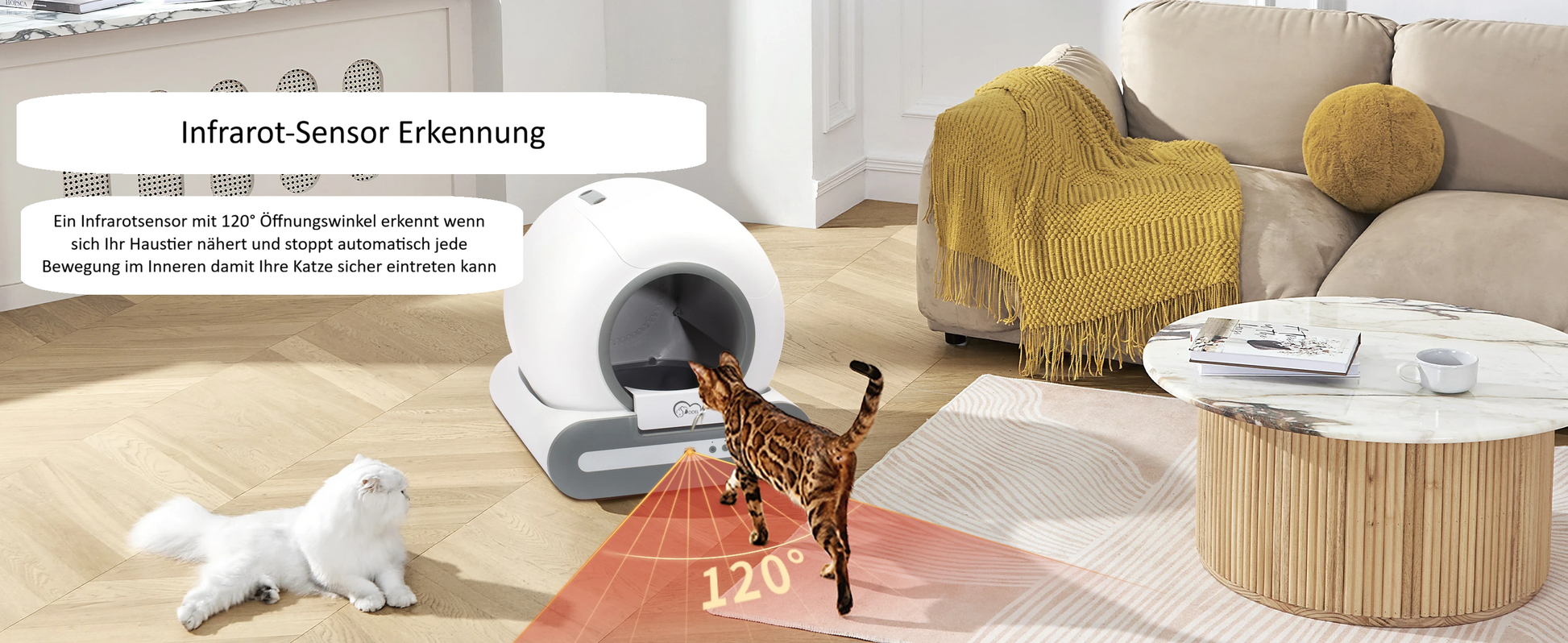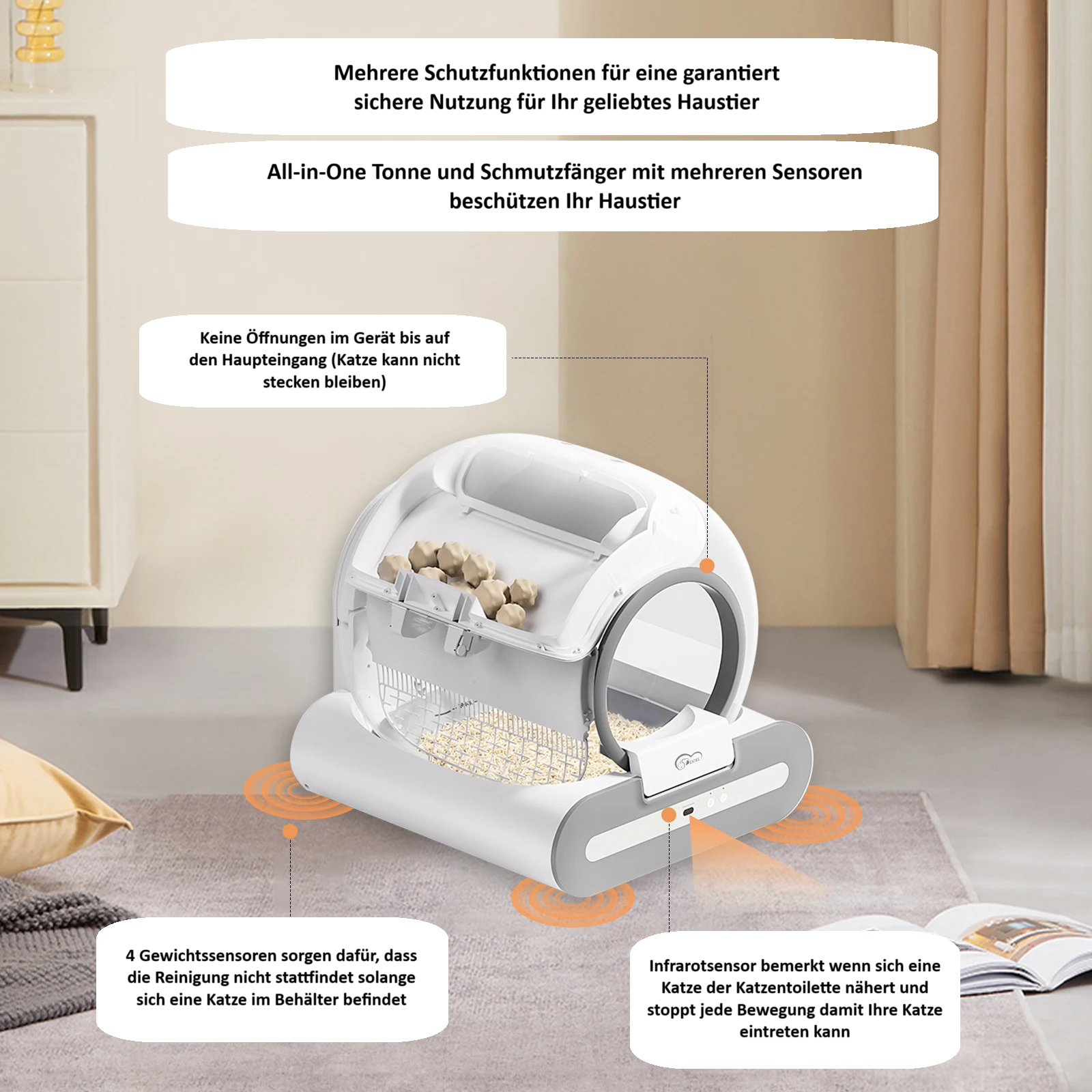 Diese Katzentoilette ist mit 4 Gewichtssensoren ausgestattet, die jede Bewegung zuverlässig erkennen. Zusätzlich sorgt ein Infrarotsensor dafür, dass die Trommel automatisch stoppt, sobald Ihre Katze sich nähert.