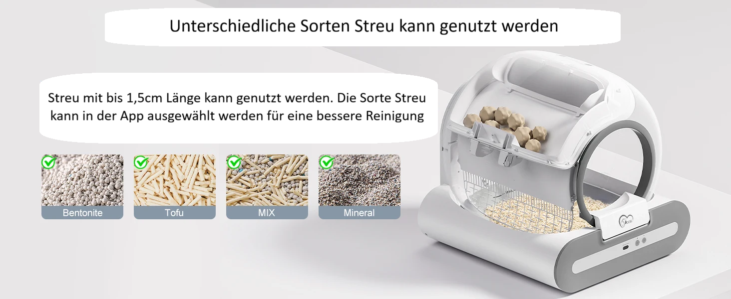 ❌ Nicht geeignet für nicht-klumpende Streu oder grobe Tofu-Stücke (> 3 mm Durchmesser, > 15 mm Länge).